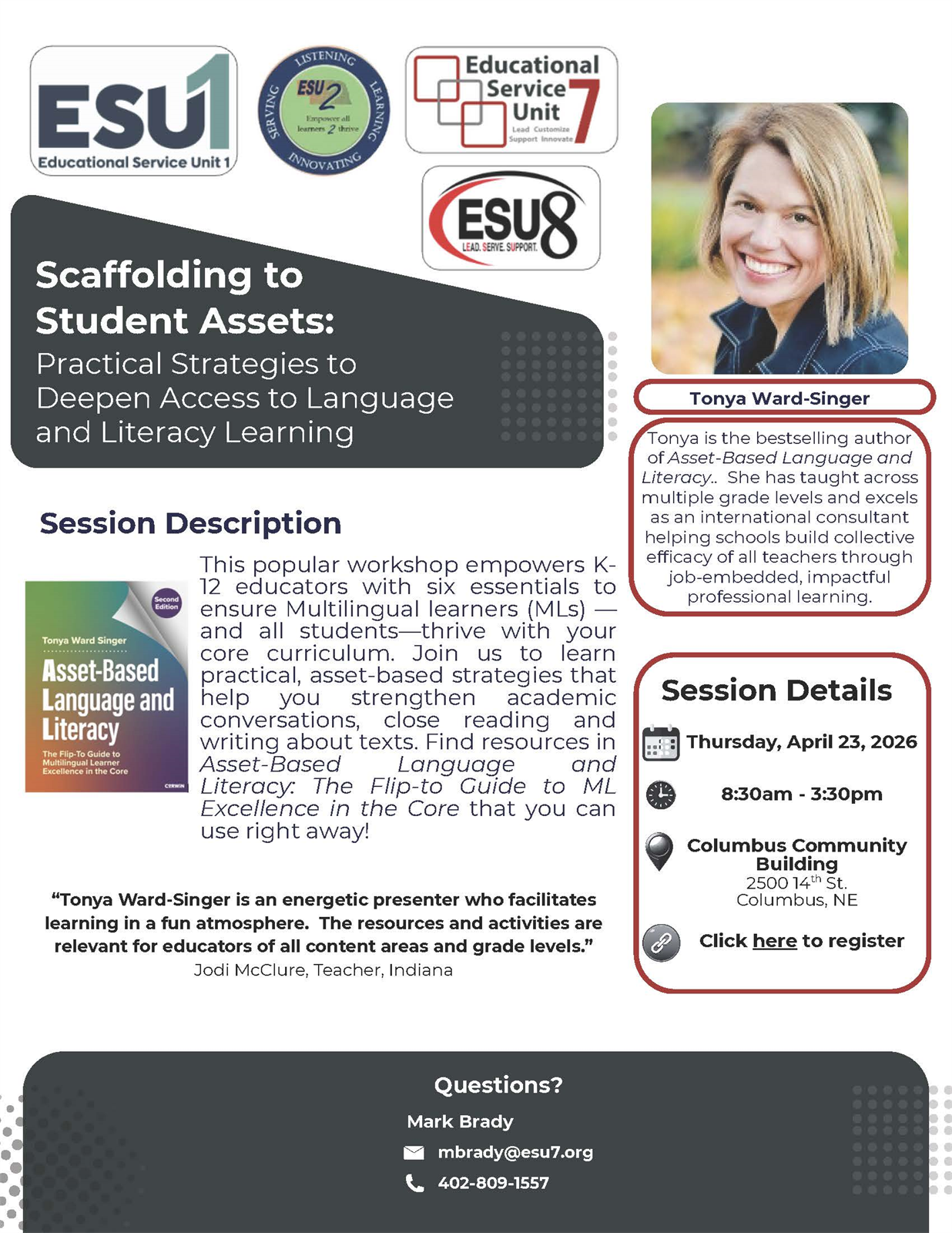 | Description | | This popular workshop, led by author and presenter Tonya Ward-Singer, empowers K-12 educators with six essentials to ensure Multilingual learners (MLs) —and all students—thrive with your core curriculum. Join us to learn practical, asset-based strategies that help you strengthen academic conversations, close reading and writing about texts. Find resources in Asset-Based Language and Literacy: The Flip-to Guide to ML Excellence in the Core that you can use right away!
