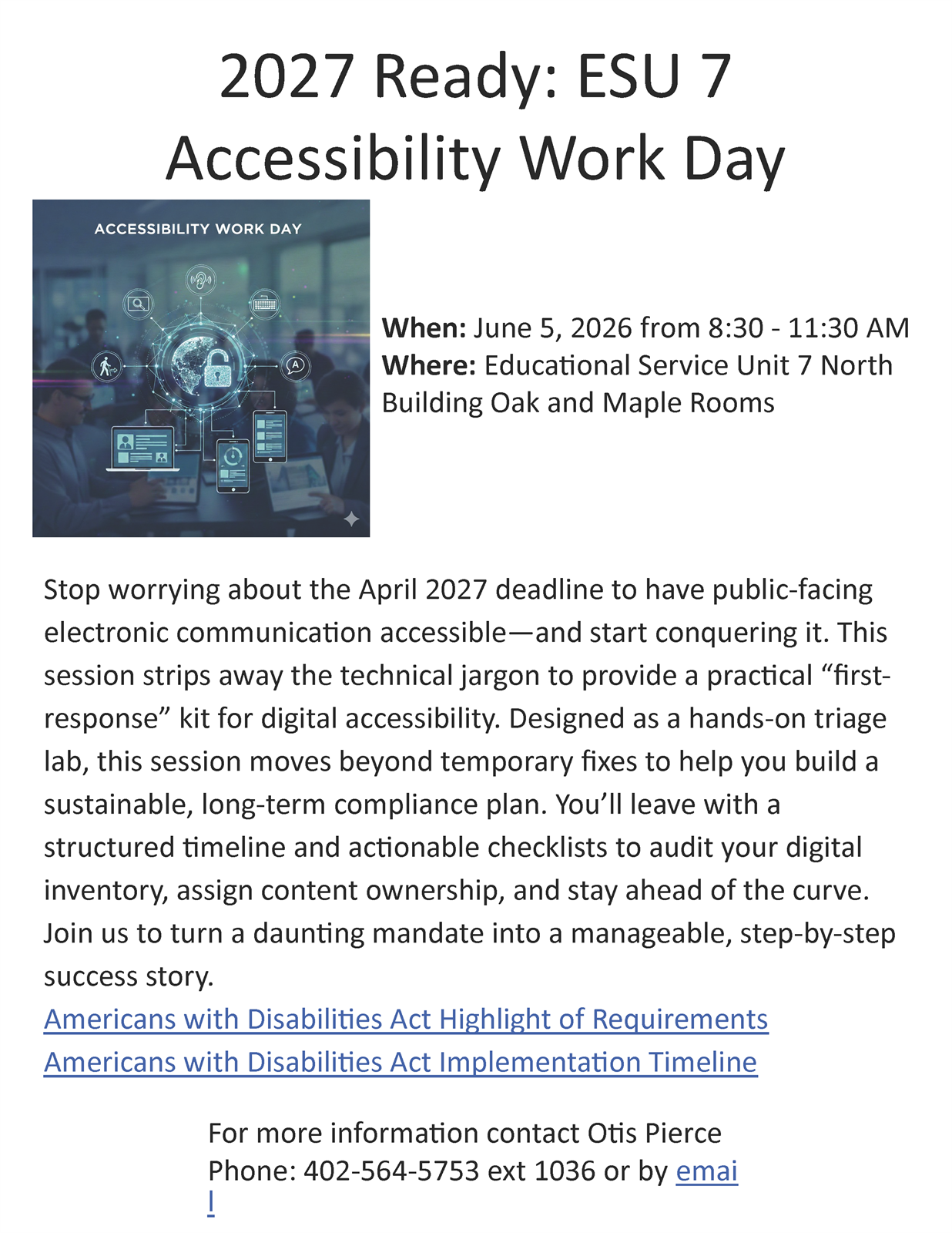 | Description | | Stop worrying about the April 2027 deadline to have public-facing electronic communication accessible—and start conquering it. This session strips away the technical jargon to provide a practical “first-response” kit for digital accessibility. Designed as a hands-on triage lab, this session moves beyond temporary fixes to help you build a sustainable, long-term compliance plan. You’ll leave with a structured timeline and actionable checklists to audit your digital inventory, assign content ownership, and stay ahead of the curve. Join us to turn a daunting mandate into a manageable, step-by-step success story.