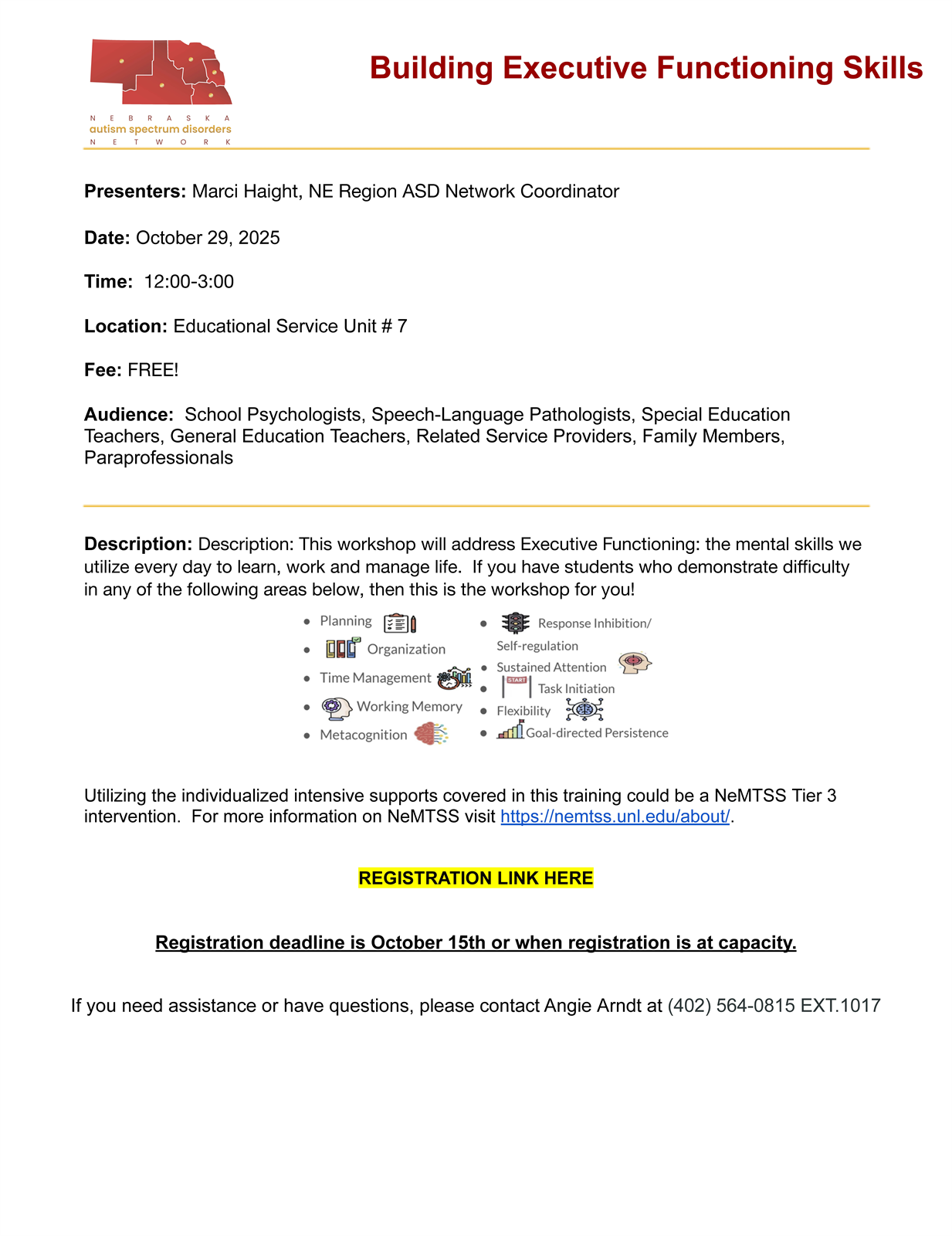 | 0 | Challenging Behaviors Series Presented by Michelle Kelly - ZOOM | 10/16/2025 1:00:00 PM | | ESU 7 ELC | | System.Collections.Generic.List`1[odie.workshops.Facilitator] | | 0.00 |  | odie.workshops.Section |