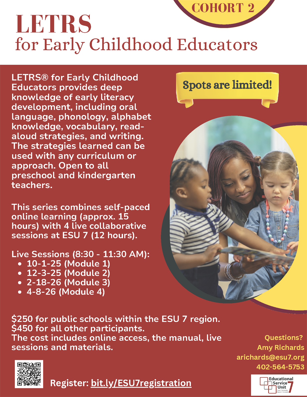 | Description | | LETRS® for Early Childhood Educators provides deep knowledge of early literacy development, including oral language, phonology, alphabet knowledge, vocabulary, read-aloud strategies, and writing. The strategies learned can be used with any curriculum or approach. Open to all preschool and kindergarten teachers. This series combines self-paced online learning (approx. 15 hours) with 4 live collaborative sessions at ESU 7 (12 hours).